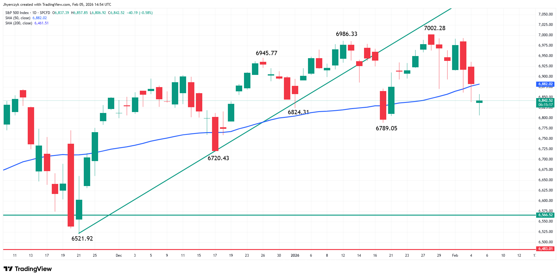El contrato de marzo E-mini del índice S&P 500 pasó a sesgo bajista el miércoles cuando cerró por debajo de la media móvil de 50 días en 6.929,77, convirtiéndola en nueva resistencia. El índice también volvió a terreno negativo en el año tras caer por debajo de 6.892,50. El impulso a la baja generado por esos movimientos pone en el radar el mínimo del 21 de enero en 6.814,50 y un nivel del 50% en 6.813,00.