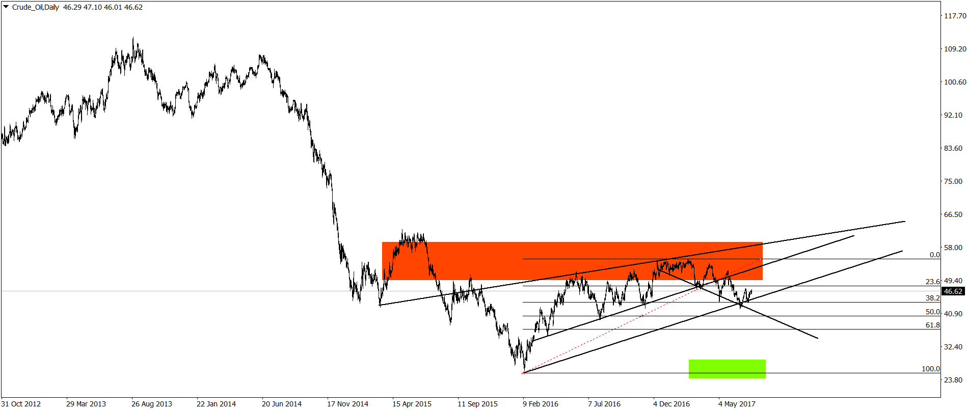 Siguiendo Fibonacci, observamos la trayectoria marcada desde principios de febrero 2016, cuando teníamos un precio de $25.60 por barril desde donde trazamos el movimiento alcista a los máximos alcanzados en $ 54.89 durante febrero 2017, movimiento que termina corrigiendo un poco más del 38.2%, ello al alcanzar los $ 42.02 por barril, dando lugar a un posible movimiento técnico alcista de continuación temporal, de la mano con el análisis de precios y la actual debilidad del dólar americano.