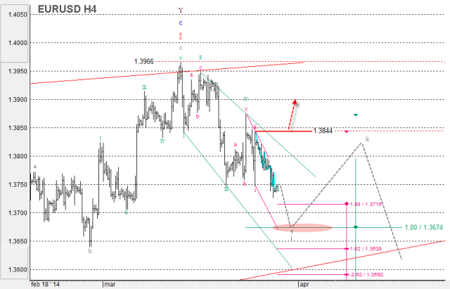 Análisis: Probablemente, se va formando la primera onda que empezó en la tendencia bajista, que toma la forma diagonal. Localmente, se forma la quinta onda, con niveles objetivos 1.3670. Si la suposición es cierta, y el precio no penetra el nivel crítico 1.3844, es lógico esperar la reducción del precio hacia los niveles 1.3670 – 1.36.