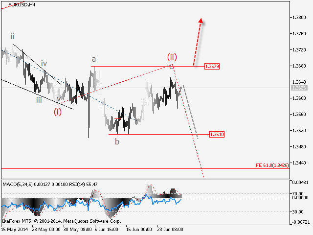 Análisis: Probablemente, finaliza la formación de la corrección local dentro de la segunda onda (ii), cual tomó la forma de plano irregular, y un poco se complicó. Localmente, es probable que haya finalizado la formación de la onda c of (ii), y si la suposición es cierta, el par continuará la baja dentro de la tercera onda. Para este escenario el nivel crítico es 1.3680. En caso de su ruptura, se obtendrá la continuación del crecimiento del par, y la profunda corrección dentro de la segunda onda hacia los niveles 1.3750 – 1.38.