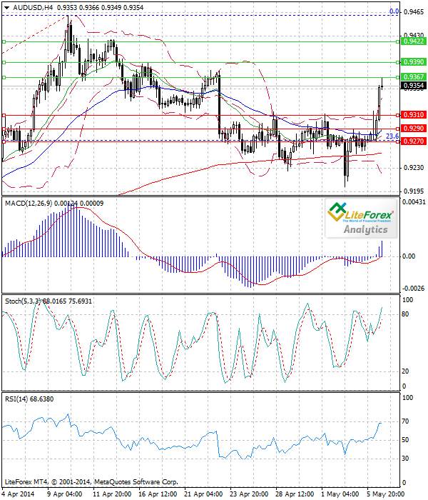 Durante la sesión negociación de ayer el tipo de cambio del AUD/USD ha caído ligeramente en medio de malas estadísticas chinas. Presión adicional sobre el par fue causado por los datos sobre el número de permiso para construir en Australia. Este índice resultó ser más bajo que el nivel anterior de 22,9%, que asciende a 20%. Hoy en día, el par AUD/USD ha recuperado las pérdidas, subiendo a máximos del día anterior. El Banco de Reserva de Australia decidió dejar la tasa de interés sin cambios en el nivel del 2,5%. Por lo tanto, la Dirección Regional tiene previsto aumentar la demanda de moneda nacional y apoyar el crecimiento económico. La pareja ha roto su nivel de 0.9310; consolidándose por encima de este nivel. Hoy en día, la balanza comercial estadounidense se dio a conocer, disminuyendo su déficit de 41,9 mil millones a 40,4 mil millones.