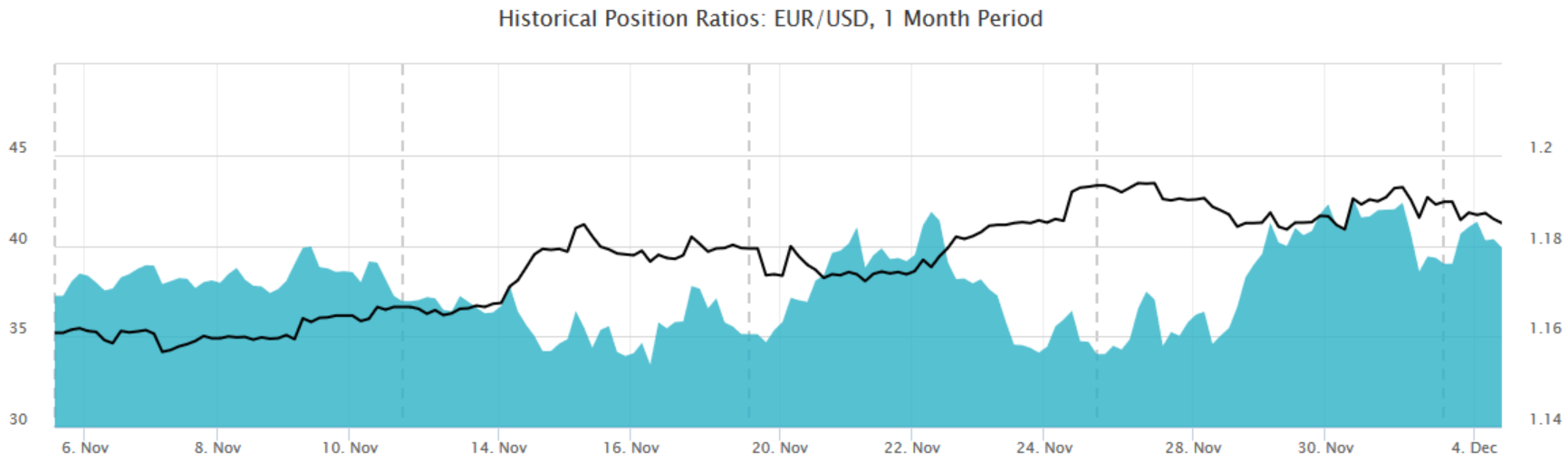 Siguiendo el sentimiento del mercado (figura 2), observaremos un grupo minorista de traders empezando a buscar las compras, guiados por el movimiento alcista que ha estado desarrollando el instrumento desde principios de año, movimiento que se empezó a debilitar a mediados de septiembre y el que volvió a tomar fuerza a principios de noviembre y del que se espera continúe alcista, pero perdiendo fuerza.