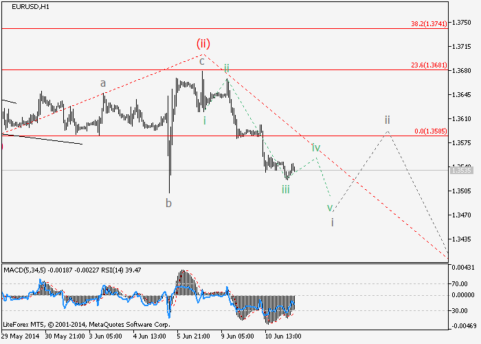 Es de suponer que la formación de la corrección al alza en la segunda ola, que tuvo una forma de la llanura irregular, ha concluido. A nivel local, se está formando la primera onda i en derivaciones de (iii), y si el precio no sube más alto que el nivel de los 1.3680 como parte de pequeña corrección, el par seguirá disminuyendo en la tercera ola.