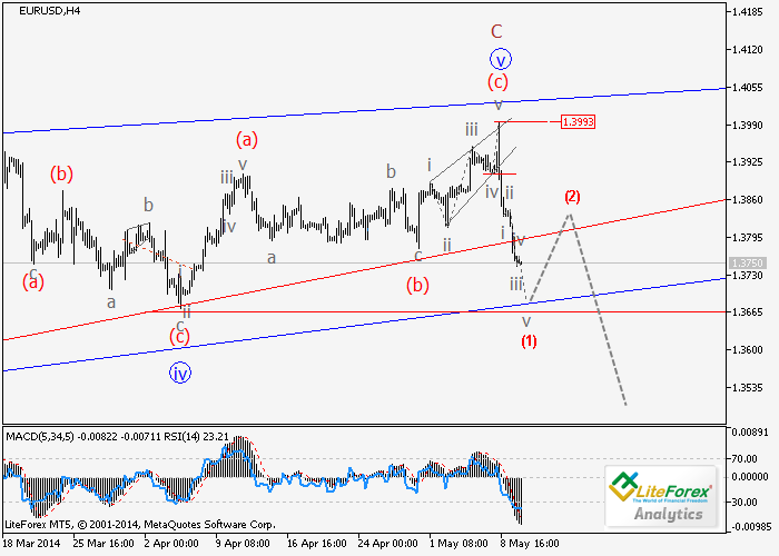 Presumiblemente, la formación de zigzag (a) (b) (c) en el quinto ola final del triángulo diagonal en la onda C de la corrección a largo plazo ha completado. En estos momentos se está formando la primera ola, lo que parece desarrollarse como un impulso. Si esta hipótesis es correcta, el par seguirá disminuyendo a los niveles de 1,3720 a 1,3700. Como un escenario alternativo, es posible que el nivel de 1,3780 se descompone y el par seguirá subiendo hasta el nivel de 1,3900 a 1,3990.