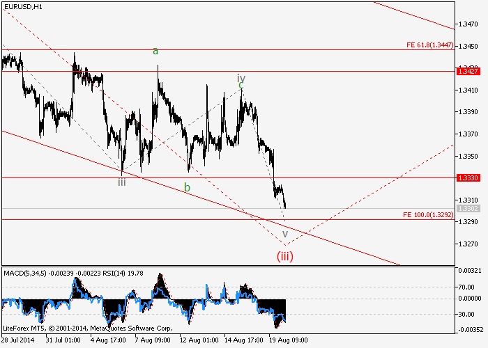 Ayer el par EUR / USD ha llegado a mínimos locales en 1.3330, y ahora el par se negocia en torno a 1.3300. Es de suponer que la tendencia bajista sigue siendo fuerte dentro de la tercera ola (iii). En la escala inferior podemos ver el final de la onda quinta v de (iii). Si la presunción es correcta, el par se corregirá en el seno de la cuarta ola (iv) hacia la frontera superior del canal descendente (1.3430).