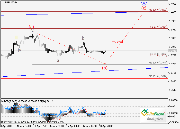 Es de suponer que la formación de la corrección a la baja en la onda (b) está a punto de concluir. Si esta hipótesis es cierta, la ruptura de los máximos locales de 1,3866 confirmará el inicio de la tercera ola (с) de V. Nivel crítico para este escenario es 1.3670.