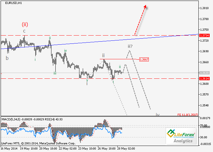 Es de suponer que se está formando la tercera oleada del ímpetu descendente. Por el momento, la primera ola – se ha formado ii de (iii) de las categorías inferiores – i de (iii), y la segunda ola. Si esta hipótesis es correcta, y el precio no rompe el nivel crítico de 1.3735, el par continuará disminuyendo en la tercera ola (iii) a los niveles de 1,3500 a 1,3400.