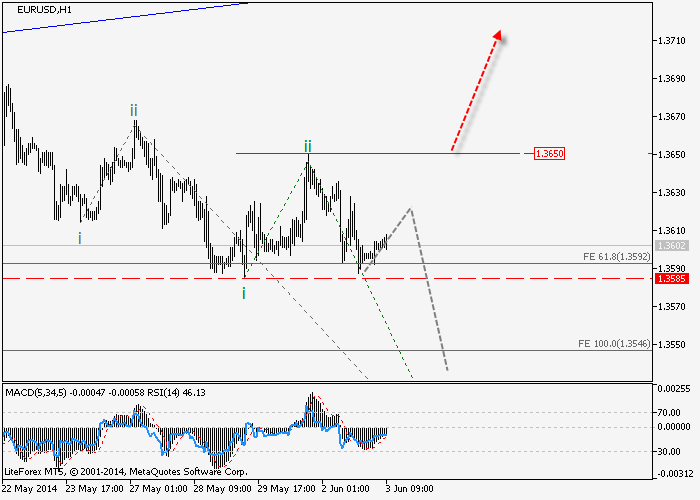 Es posible que la tercera ola del impulso local bajista comienza a extender. Por el momento, el precio se ha formado un par de ondas en derivaciones 1-2-1-2; si esta suposición es correcta, y el precio no rompe al alza el nivel crítico de 1.3650, el par seguirá disminuyendo hasta los niveles de 1,3470 a 1,3370. Como un escenario alternativo, podemos suponer que en caso de ruptura del nivel de 1.3650 una cuña completa se puede formar, así como la corrección de profundidad hasta el nivel de 1,3780.