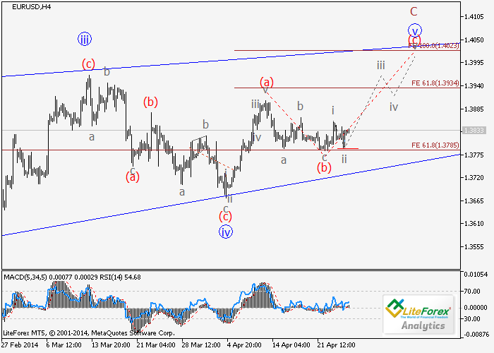 Es de suponer que se está formando la onda (с) de V. A nivel local, se ha formado la primera y segunda ola. Si esta hipótesis es cierta, y el precio no rompe el nivel crítico de 1.3789, es lógico esperar que el aumento en el par en la tercera ola hasta el nivel de 1,3950.