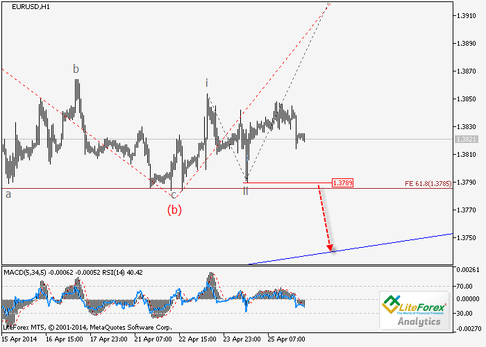 Ruptura del nivel de 1.3789 es posible, lo que permitirá que el precio continuará descenso hasta los niveles de 1,3750 a 1,3700 en la onda (b).
