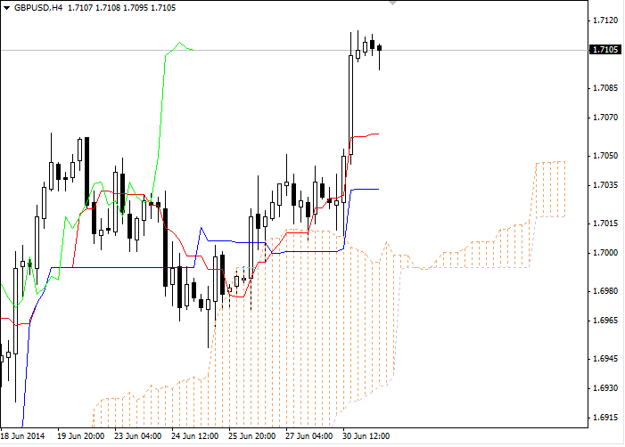 En el gráfico de cuatro horas la línea Tenkan-sen está por encima de Kijun-sen, ambas son horizontales. La línea Chinkou Span está por encima de la evolución del precio; la nube actual es ascendente. Después de una subida brusca del par se ha ralentizado el movimiento ascendente. Línea Tenkan-sen está en el nivel de soporte más cercano (1,7062). Uno de los máximos anteriores de la línea Chinkou Span se espera que sea un nivel de resistencia en 1.7300.