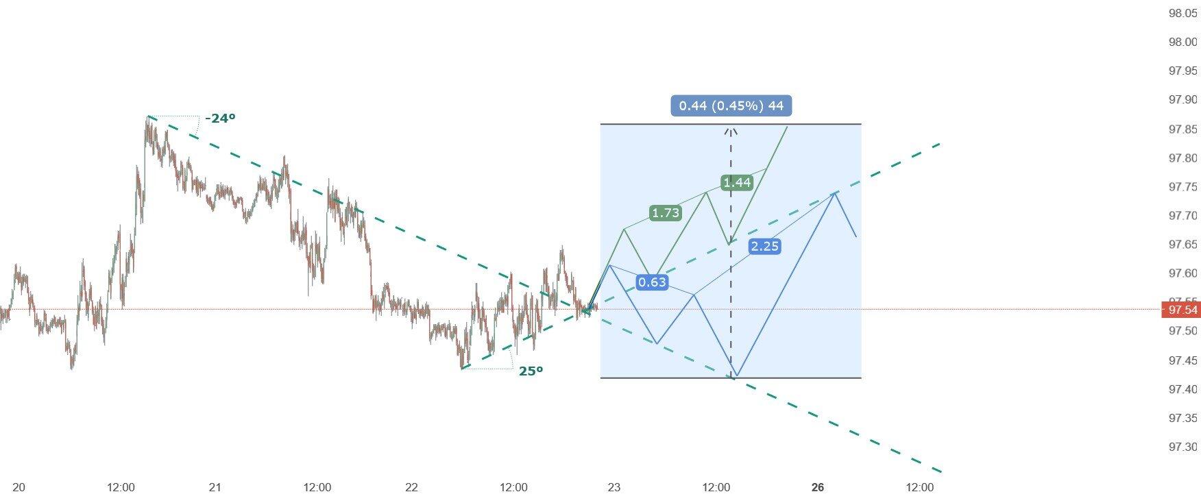 Se espera que en el muy corto plazo (siguiente jornada de trading) el dólar se logre fortalecer, sabiendo que se encuentra en un pequeño soporte horizontal alcista(trayectoria verde), sin embargo, en segundo escenario, existe aún la posibilidad de una debilidad (trayectoria azul), alineados con el sentimiento minorista se mantiene en un área de compras, más aun después de la reciente subida de tipos por parte de la FED, lo que da fuerza a la temporal debilidad del dólar para encontrar equilibrio, sin perder de vista el objetivo alcista.