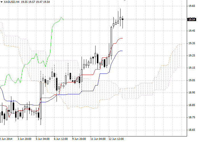 Echemos un vistazo al gráfico de cuatro horas. Línea Tenkan-sen está por encima Kijun-sen, son tanto horizontales. La línea Chinkou Span está por encima de la evolución del precio; la nube actual es ascendente. Al comienzo de la semana el par ha roto a través de la nube y sigue creciendo. La línea Tenkan-sen está al nivel de apoyo más cercano de 19.39. Uno de los máximos anteriores de la línea Chinkou Span se espera que sea el nivel de resistencia en 19.88.