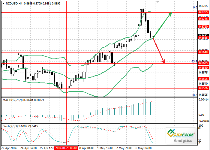 El par NZD / USD ha estado creciendo durante dos semanas y alcanzó el nivel de 2011 máximo (0,8779). Sin embargo, tras el anuncio del jefe del Banco de Nueva Zelanda el par se ha corregido. Graeme Wheeler advirtió a los inversionistas que si los precios de los productos lácteos siguen cayendo, el regulador tomará algunas acciones para debilitar al NZD. Precios de los lácteos han disminuido durante seis semanas, por lo que el NZD crece más fuerte y afecta a la exportación. La corrección se ha ralentizado después de la liberación de las estadísticas positivas del mercado de trabajo de Nueva Zelanda; indicador de empleo superó las previsiones y alcanzó el nivel de 0,9%.