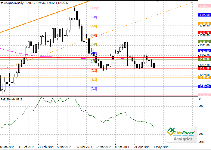 Cotizaciones de XAU / USD no pudo consolidarse por encima de los niveles importantes de 1300.00 y ha comenzado a declinar. Por el momento el precio es a nivel de apoyo de 2/8 Murray , que coincide con el nivel de 1.281,25 . A partir de este nivel de la pareja puede experimentar corrección técnica , o incluso una tendencia puede cambiar y el precio puede volver al nivel de resistencia de los 1.300,00 .